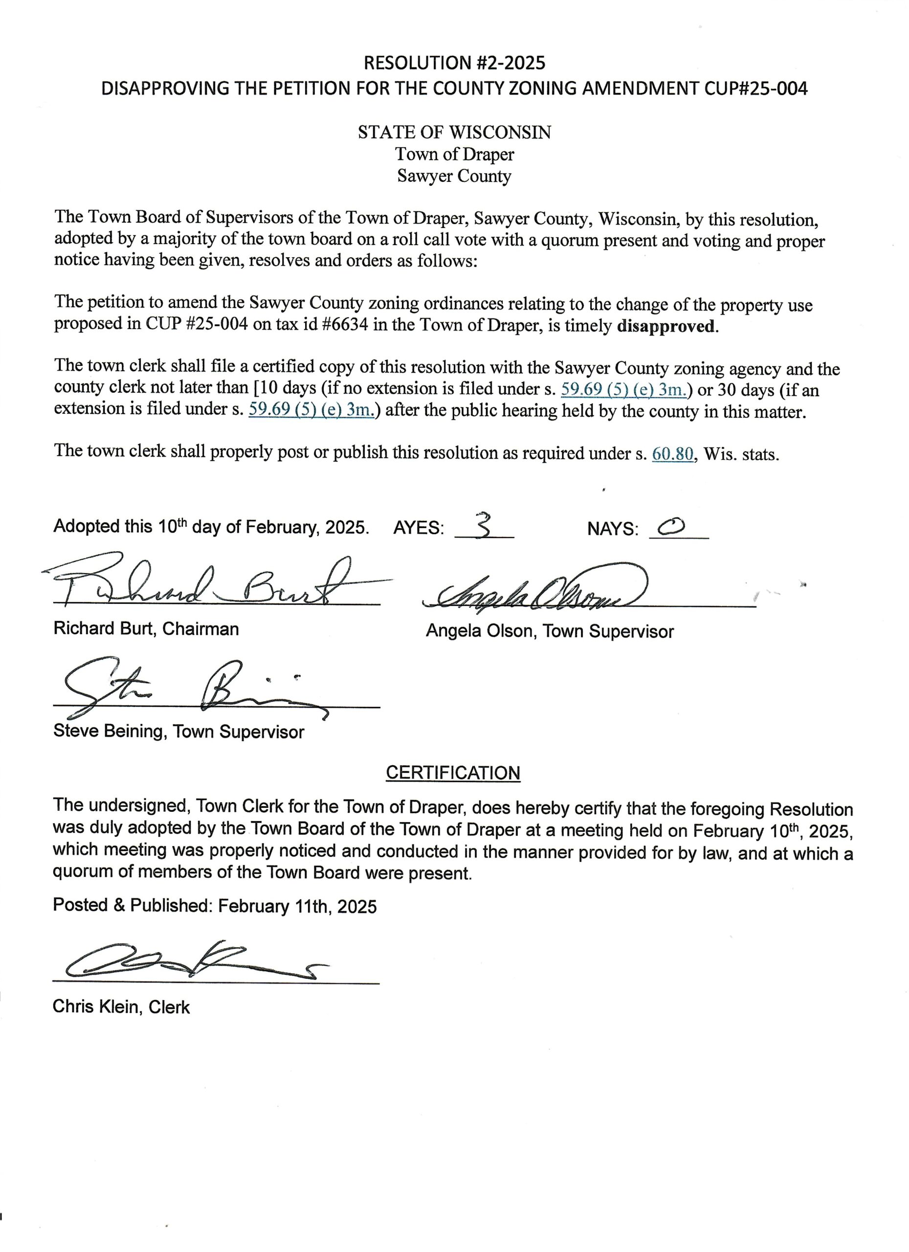 The town board voted to deny the Conditional Use Permit #25-004 for a 32-plat Perpetual Family Burial Site on Zett Rd.